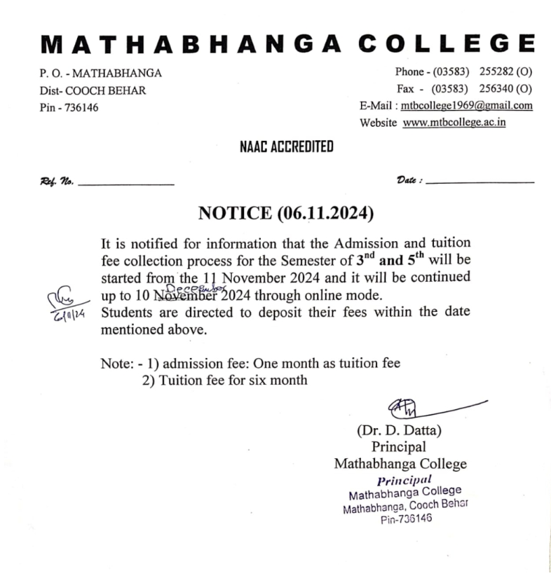 Notice for the Admission and Tution Fee collection process for the Semester of 3rd and 5th